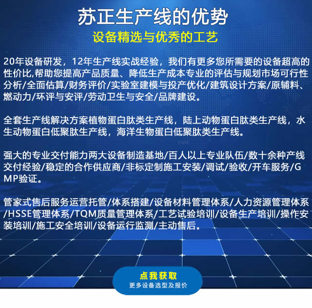 原料的質量檢驗、原料的前處理、熱提工段、除油工段、生物酶解工段、過濾分離、脫色過濾、濃縮工段、殺菌工段,干燥工段,軟水處理,CIP清洗系統等。
